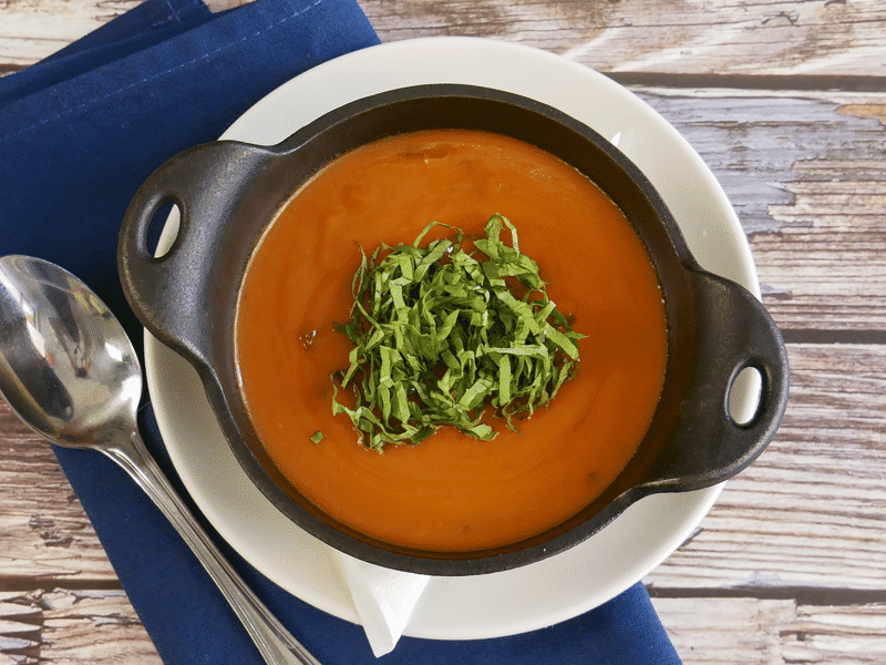 panko-crusted fried green tomatoes over creamy stone-ground goat cheese grits and red pepper coulis, topped with fresh basil (600 cal)